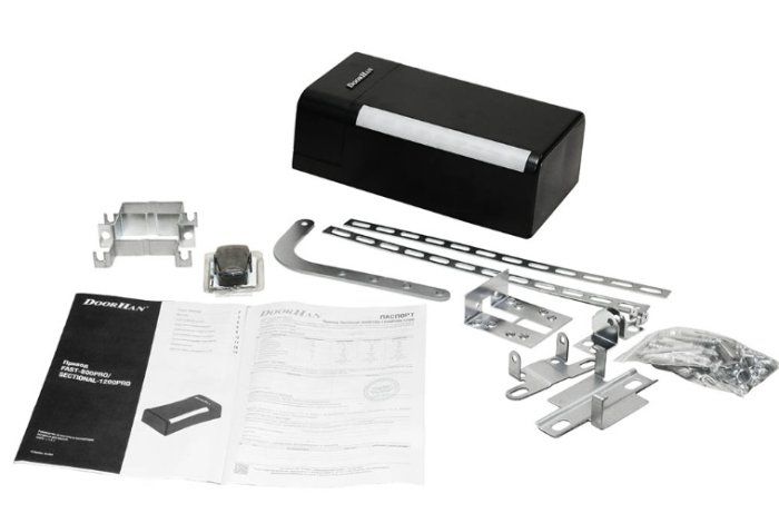 В состав комплекта входит электропривод с кронштейнами, 4-хканальный пульт дистанционного управления, направляюща рейка с цепью 3600 мм.